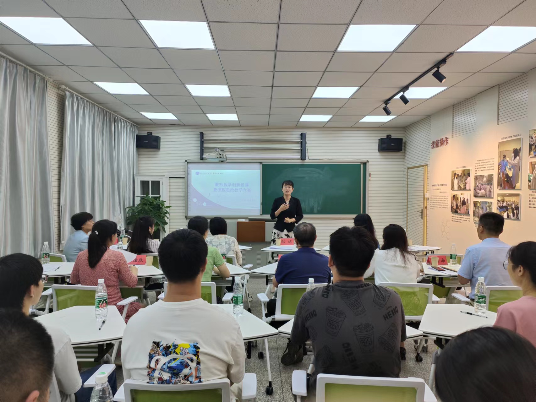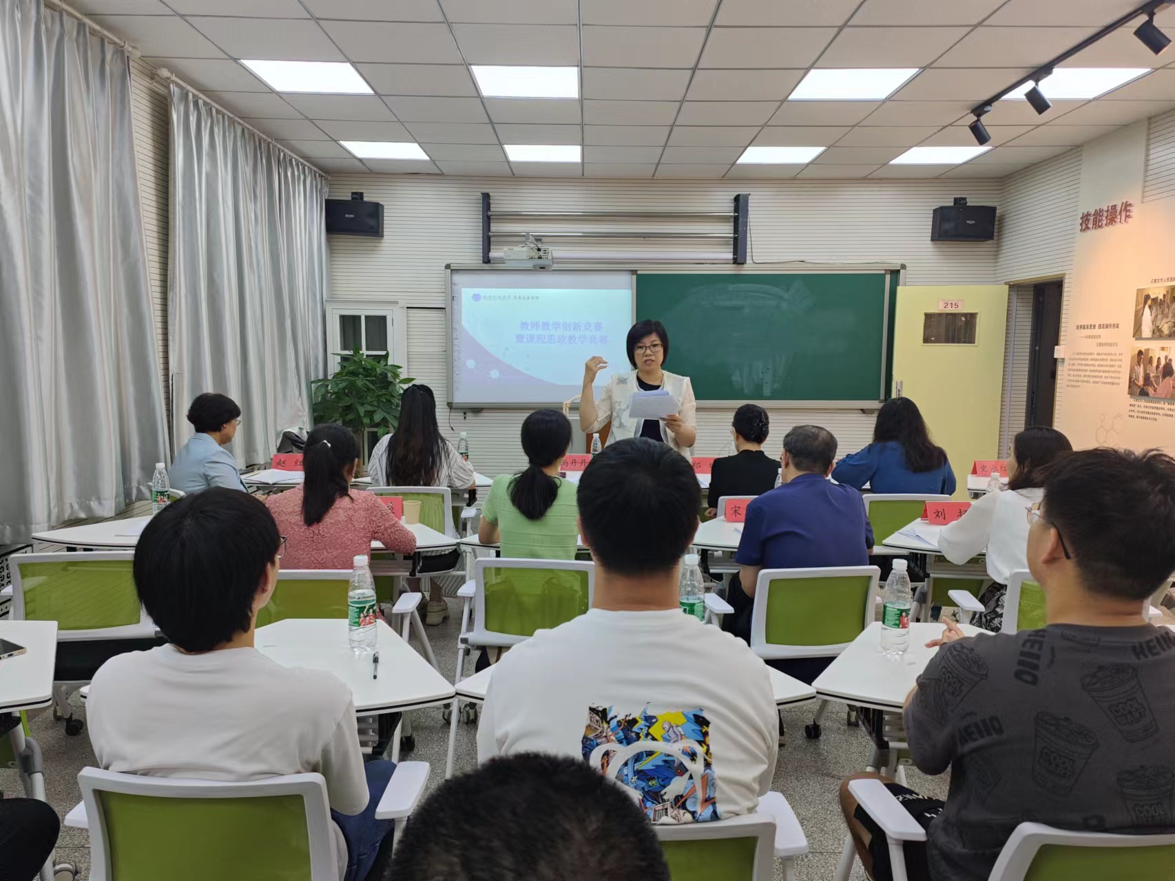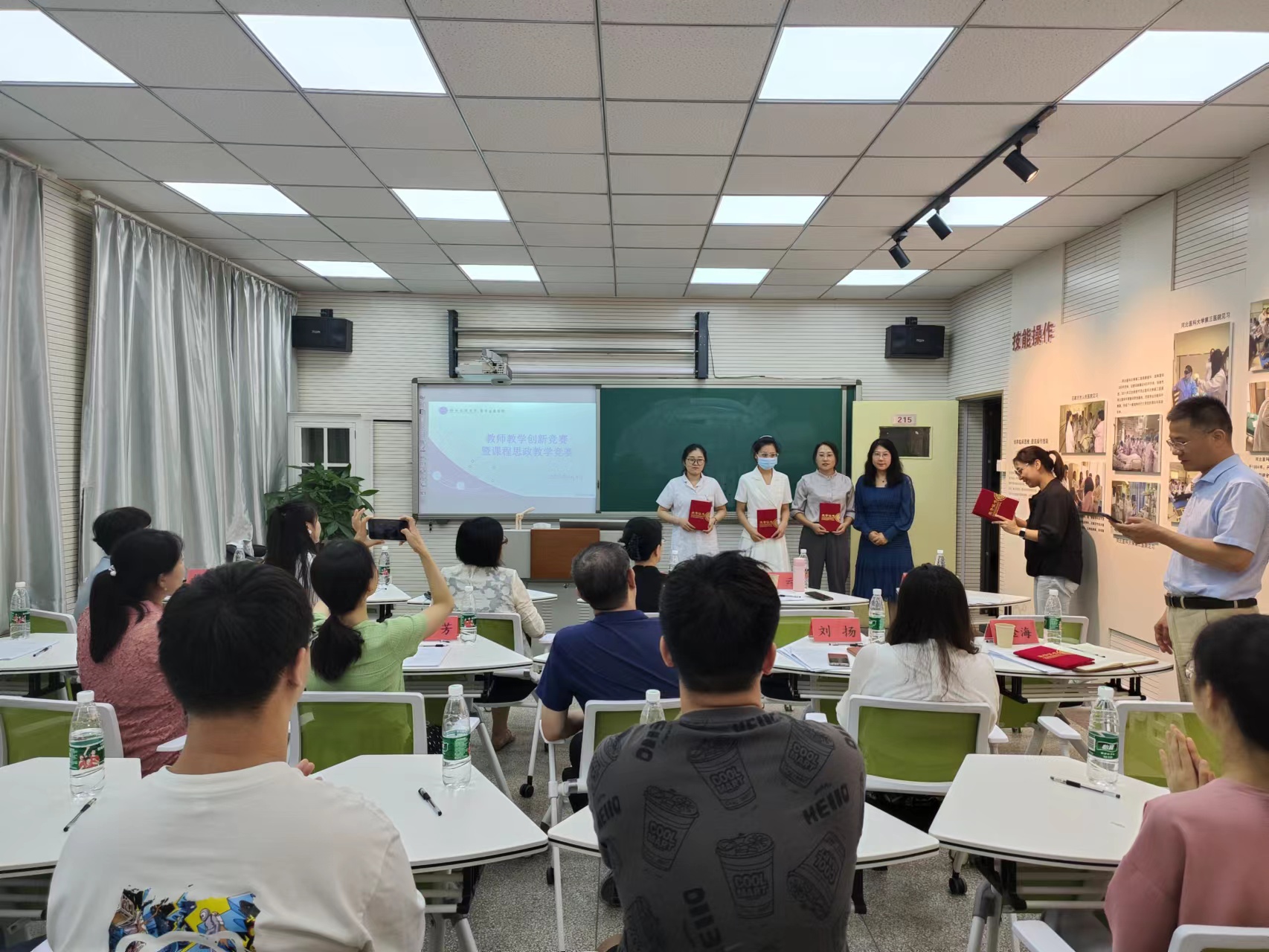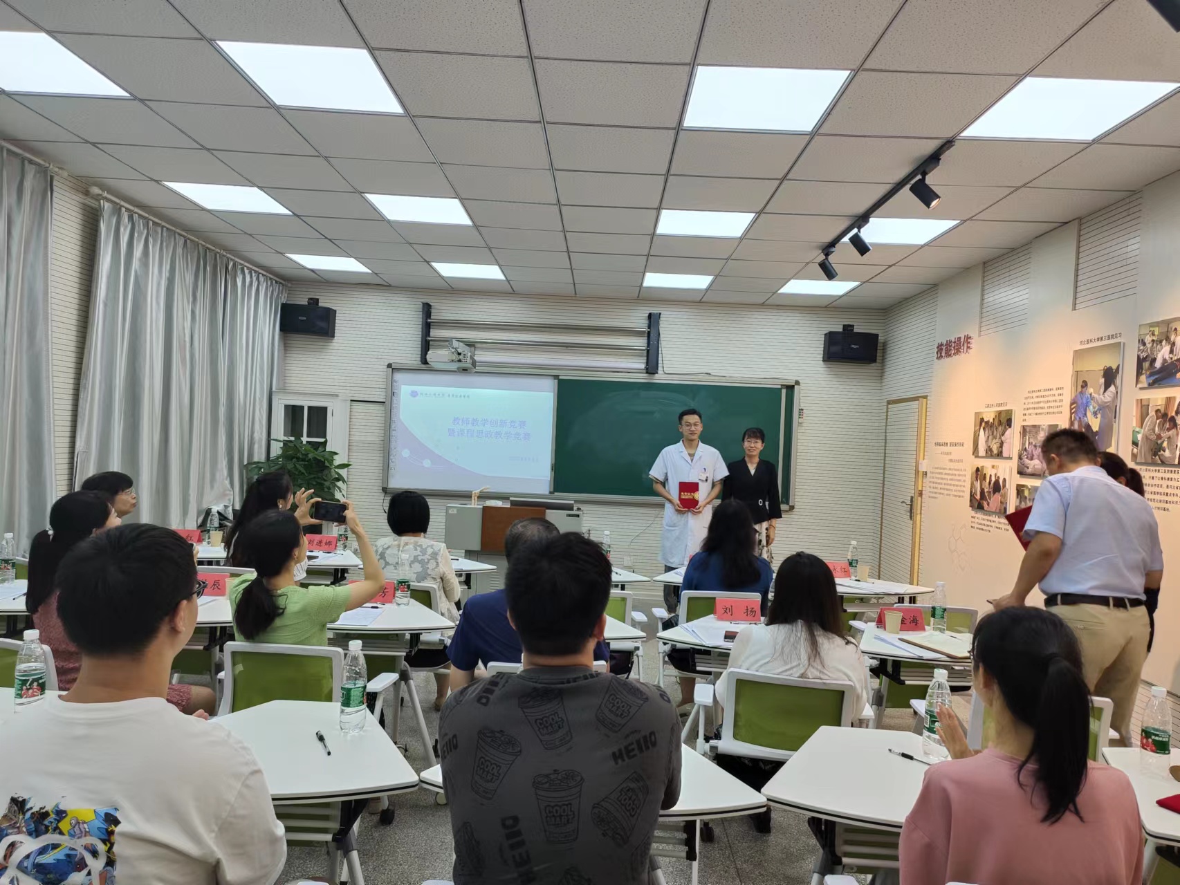 此次竞赛特邀学校教师发展中心主任、河北省高校中青年骨干教师郑斌教授,医学影像学院书记、全国高校教师教学创新大赛一等奖获得者尚丹丹教授,马克思主义学院院长、河北省高等教育教学成果一等奖获得者柳云教授,中医基础教研室主任、河北省首届本科高校课程思政教学竞赛二等奖获得者刘进娜老师担任专家评委,学院领导、学系相关负责人、教研室负责人、学院工作人员、参赛教师、学生评委及志愿者等20余人参加活动。